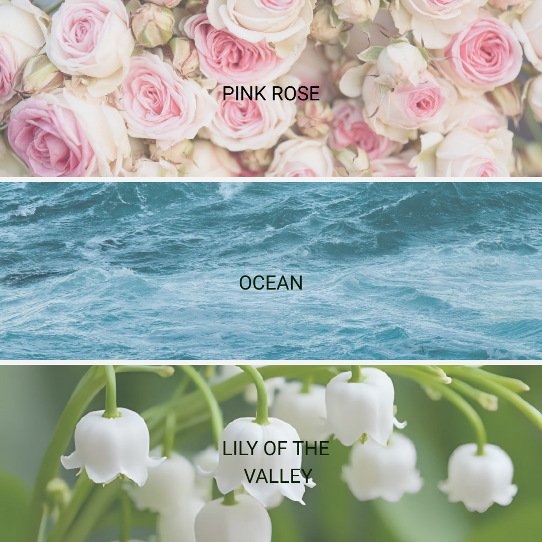 lily of the valley. pink rose. ocean