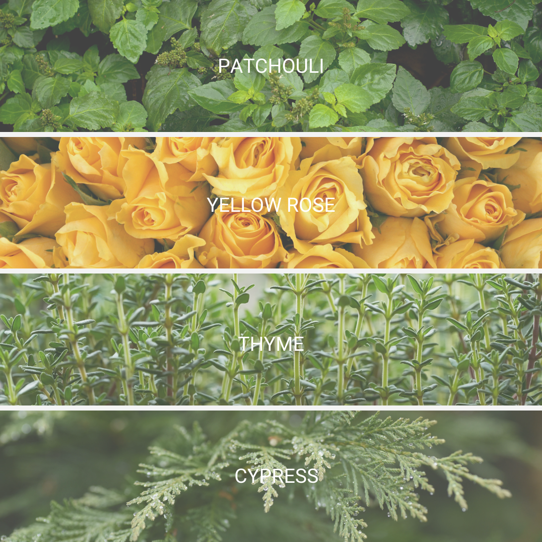 patchouli. yellow rose. cypress. thyme.